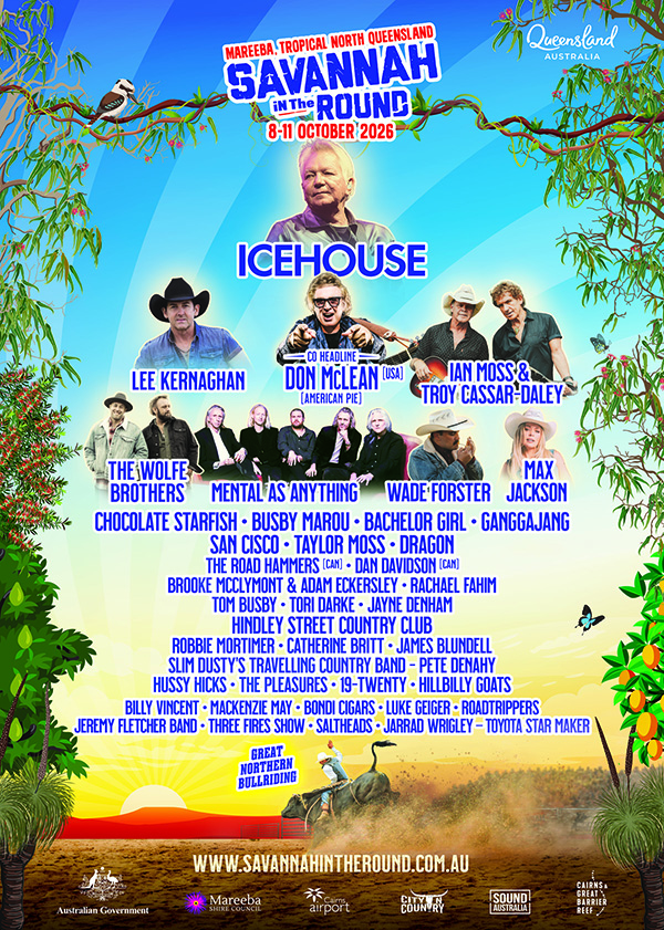 We are excited to announce that ICEHOUSE will be headlining one night of Savannah in the Round at the Mareeba Rodeo Arena in the Cairns Hinterland! This amazing festival will feature multiple artists through four days of great entertainment across several stages. It will all take place October 8th through the 11th, 2026.